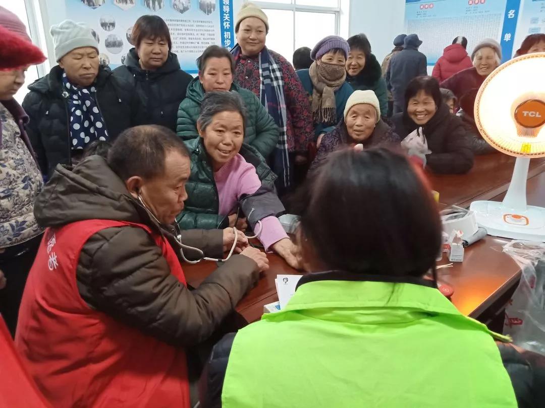 在义诊现场可以看到前来检测的村民络绎不绝,检测区域被村民围得水泄不通,问诊、检查、诊断、量血压、测血糖等义诊工作有条不紊地进行。